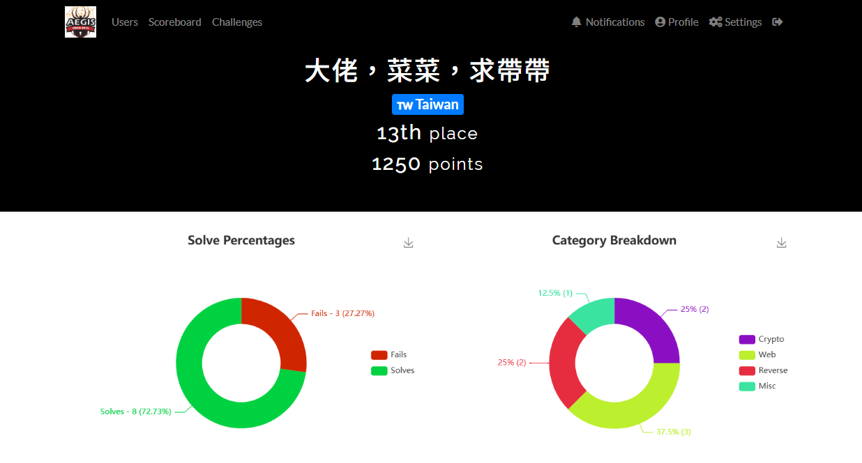 這次神盾各領域都是2題 差一點點進決賽QQ (10-13名都同分 比時間QQ) 負責了misc的通靈部分跟rev的兩題 pwn解到漏洞利用了但是卡在最後一步 這是隊友的 crypto WP -> https://hackmd.io/@eeeeee/BkXJPDHhgg